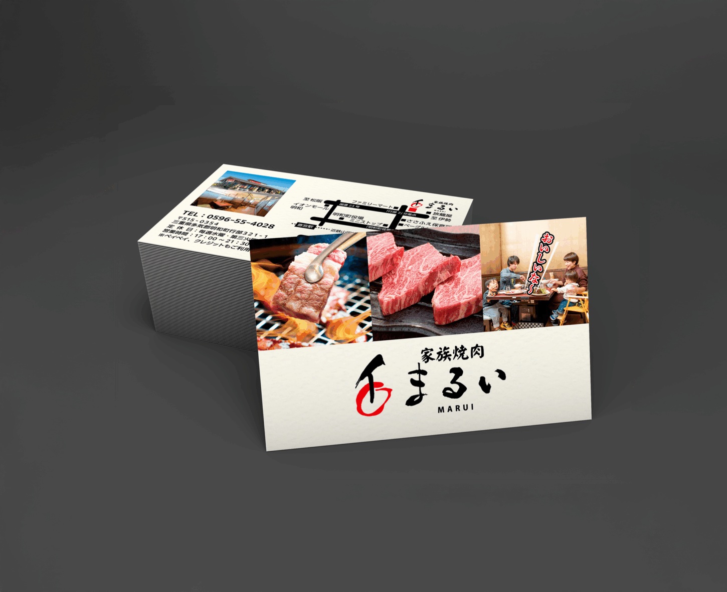 三重県明和町で焼肉店を営まれている「家族焼肉まるい」様のショップカードデザイン