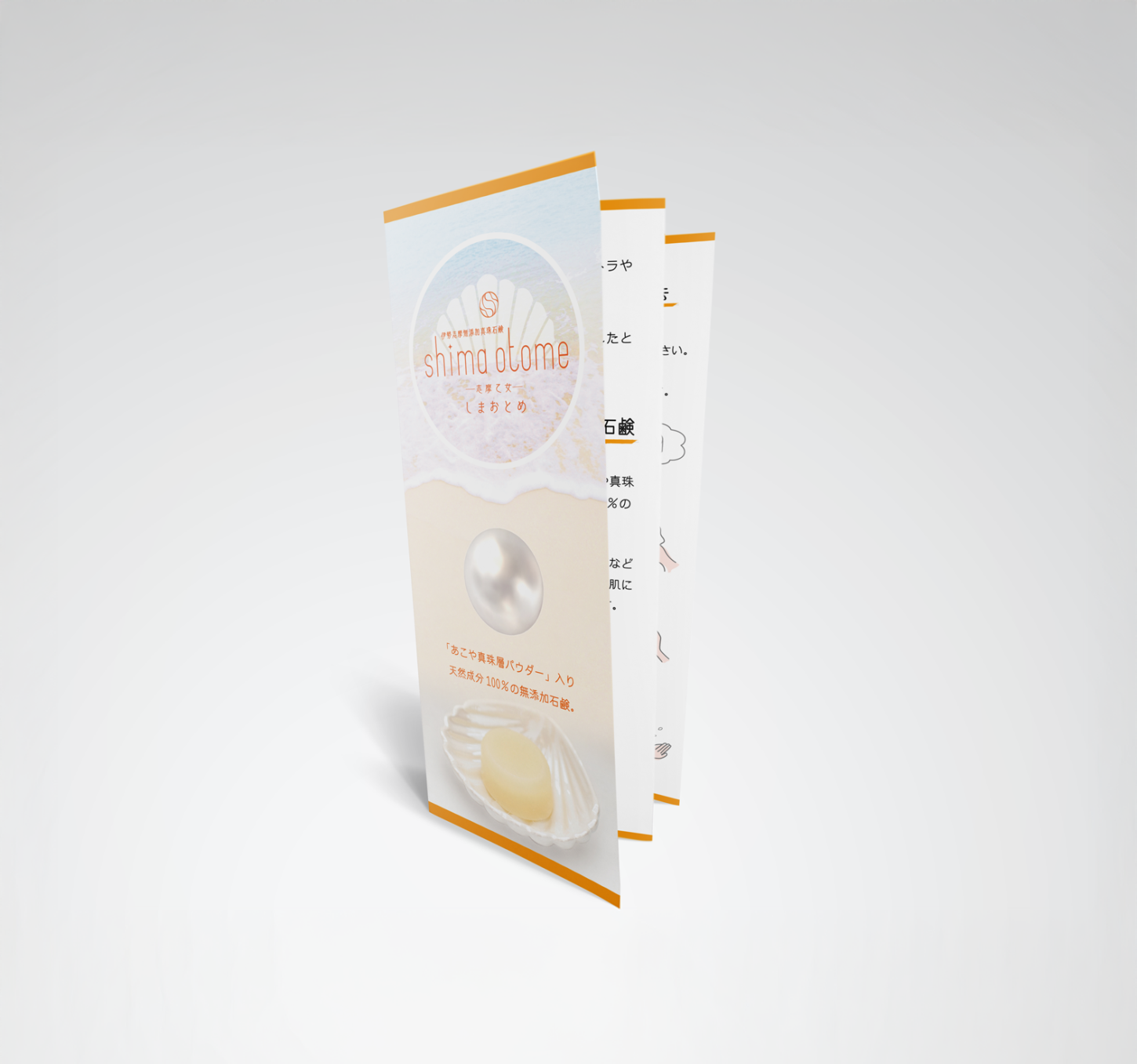 志摩市で真珠販売卸業を営まれている優成様の石鹸「志摩乙女 しまおとめ」のリーフレットデザイン